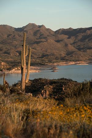 Wildflowers bloom underneath the Saguaros in Arizona