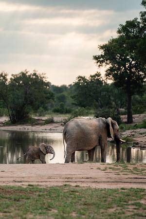 Elephant mother and child wander around a water hole in Kruger National Park, South Africa. Wildlife Photography
