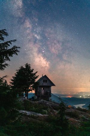 Milky Way over a backpacking hut in British Columbia